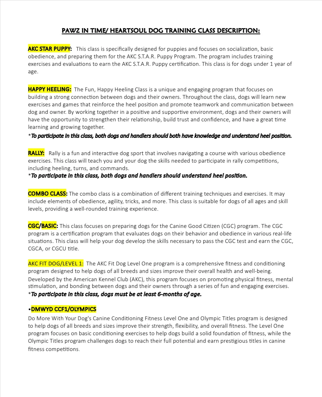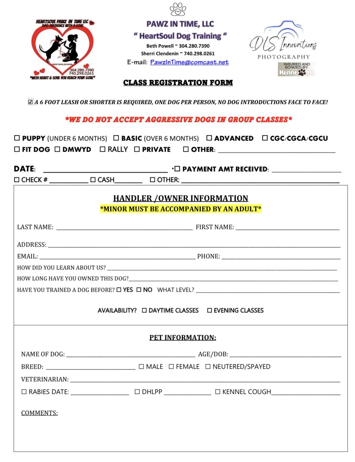 SHOT RECORDS: Puppies must have at least two sets of shots (DHPP). Rabies required 5 months of age and older. Adult dogs must be current with DHPP (Titers accepted). Shot records can be mailed, texted, or emailed with class application. Bordetella/Kennel Cough is recommended, but not required. Negative Fecal Exam within 1-year. If dog or handler is not feeling well, please do not come to class. Females in season cannot come to class.